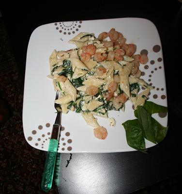 250 γρ. πέννες ή άλλο μέτριο ζυμαρικό 1 φλιτζ. άπαχο γιαούρτι 1/2 φλιτζ. τυρί φέτα κομματιασμένο 2 σκελίδες σκόρδο ψιλοκομμένο 1 κουταλιά άνηθο ψιλοκομμένο 1/2 κουταλάκι πιπέρι φρεσκοαλεσμένο 500 γρ. κατεψυγμένες γαρίδες αποψυγμένες 300 γρ. κατεψυγμένο σπανάκι αποψυγμένο και κομμένο αλάτι κατά τη γεύση